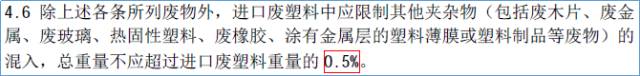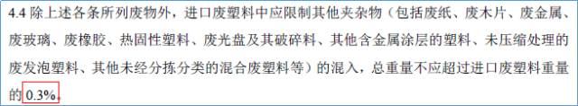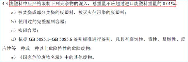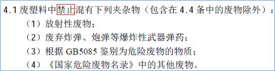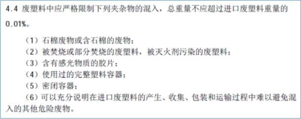 调节了危废的操纵规定,由以前的严禁带有危废進口,到限定危废的成分不超过進口废旧塑料的0.01%。