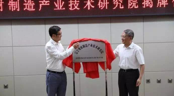 沈阳市市委副书记、常务副市长刘晓东(右)和研究院校长邢飞一同为辽宁增材制造产业技术性研究院揭牌仪式。(照片:中新网)
