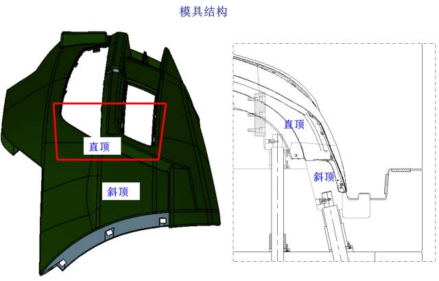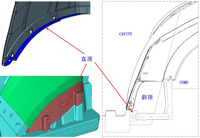 如下图所显示,商品两边选用直顶 斜导柱的组织开展出模。