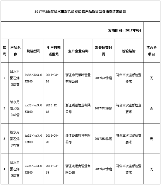 已有人阅读此文 - -7月25日,绍兴市质监局官方网站发布2017年二季度绍兴市给水用聚乙烯(PE)管产品地市级监管抽查結果,各地各部门抽查了诸暨市4家公司的4批号给水用聚乙烯(PE)管产品,不过关0批号。